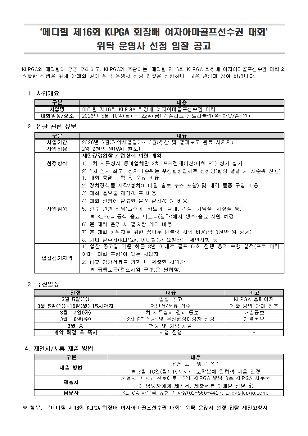 2026/03/첨부. '메디힐 제16회 KLPGA 회장배 여자아마골프선수권 대회' 위탁 운영사 선정 입찰 제안요청서 .hwp
